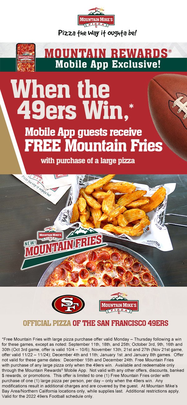 Mountain Mikes Pizza Coupon Code: When SF 49ers win, get free Mountain ... When SF 49ers win, get free Mountain Fries with purchase of a large pizza valid Monday after the game At participating locations, COUPON EXPIRED, Turn Device Sideways to see Wide In-Store Coupon, Show device to store at register, Most coupons are valid only at participating locations and not valid in AK, HI, PR or outside the USA.